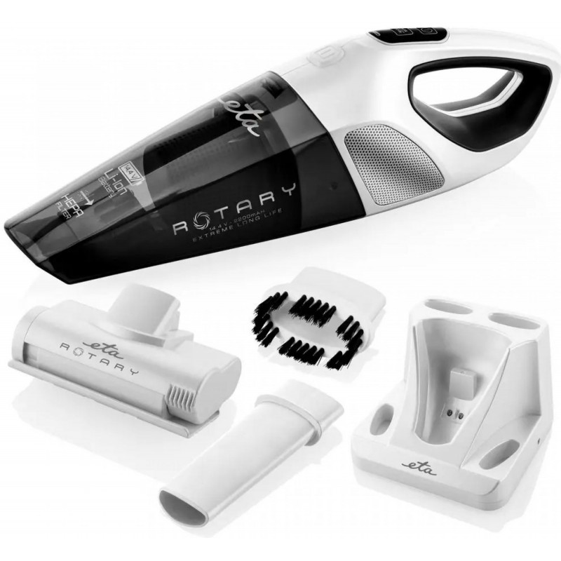 Obsah balenia - 1x ručný vysávač ETA Rotary - 1x rotačná turbokefa s priamym pohonom – je určený špeciálne pre vysávanie čalúneného nábytku - 1x štrbinová hubica – je vhodná pre vysávanie v úzkych a ťažko prístupných miestach (napr. Vvrebrách radiátorov, za nábytkom atď.) - 1x kefka s jemnými štetinkami pomáha pri upratovaní na miestach, ktoré potrebujete šetrne zbaviť prachu alebo pavučín (na nábytku, stenách či obrazoch)