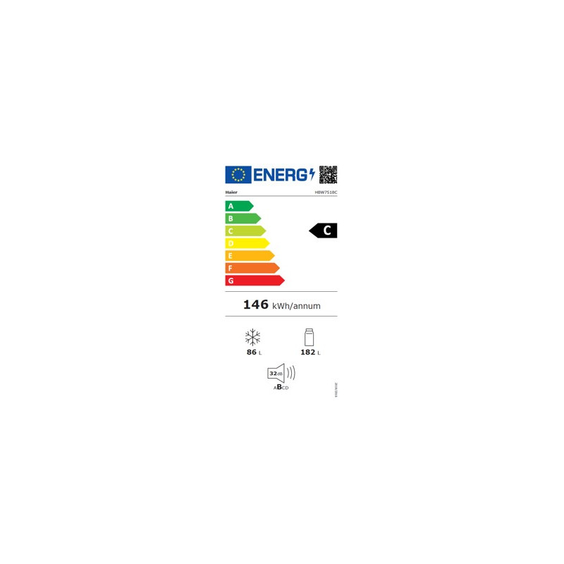 Hlavné vlastnosti (Nariadenie v delegovanej právomoci: (EÚ) 2019/2016) Trieda energetickej účinnosti: C Celkový čistý objem (l): 268 Celkový čistý objem chladničky (l): 182 Celkový čistý objem mrazničky (l): 86 Ročná spotreba energie (kWh/rok): 146 Mraziaca kapacita (Kg): 8 Úroveň emisií hluku šíreného vzduchom (dB(A)): 32 Emisná trieda hluku šíreného vzduchom: B Klimatická trieda SN.N.ST.T Hviezdičkové označenie mrazničky **** Vlastnosti WiFi + BLE – ovládanie cez aplikáciu hOn Total No Frost – duo cooling (dva chladiace systémy) Super Cooling – rýchle schladenie v chladničke, Super Freezing – rýchle zmrazenie v mrazničke Prázdninový režim, Eko režim Priemerná teplota chladničky +4℃ Priemerná teplota mrazničky -18℃ Teplotný rozsah chladničky 0~5℃ Elektronické ovládanie Akustický signál otvorených dvierok