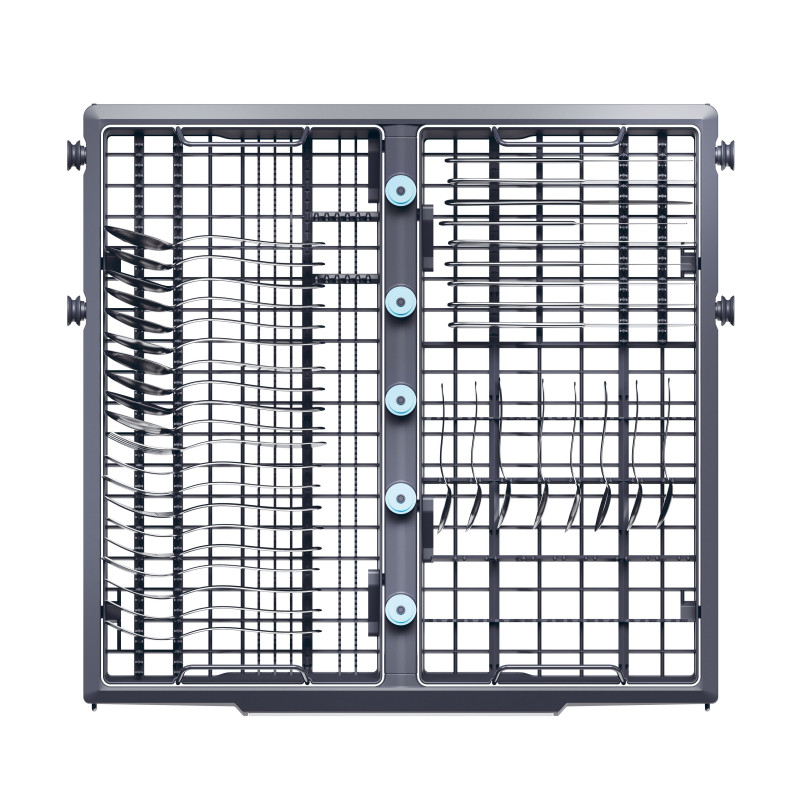 3 koše; Výklopné držiaky šálky v hornom koši, Odkladacia plocha pre poháre na víno; Polohovanie horného koša; Plne sklopiteľné držiaky na taniere v spodnom a hornom koši