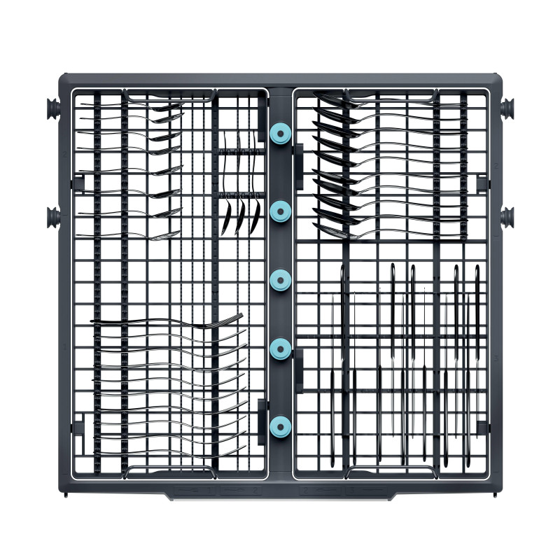 3 koše, Sklopiteľné držiaky tanierov v spodnom koši a sklopiteľné držiaky šálok v hornom koši,